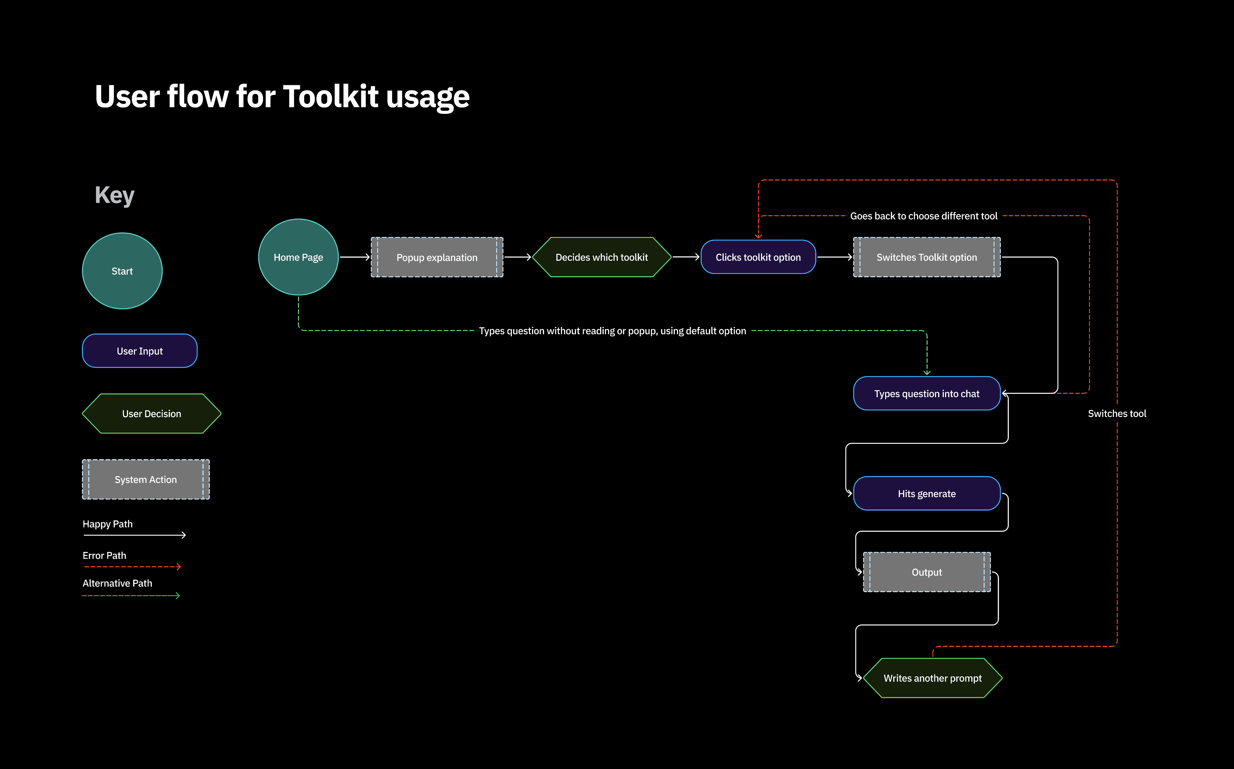 User flow to demonstrate how a user would be taught and use Toolkit